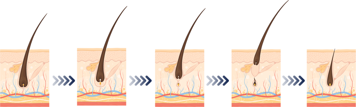 In principle, there are 4 phases to the hair growth cycle. the Anagen phase, the growth phase. The Catagen phase, a transition phase, so to say. the Telogen phase, which is a resting phase. And finally we have the Exogen phase, known as the shedding phase during which we lose hairs.