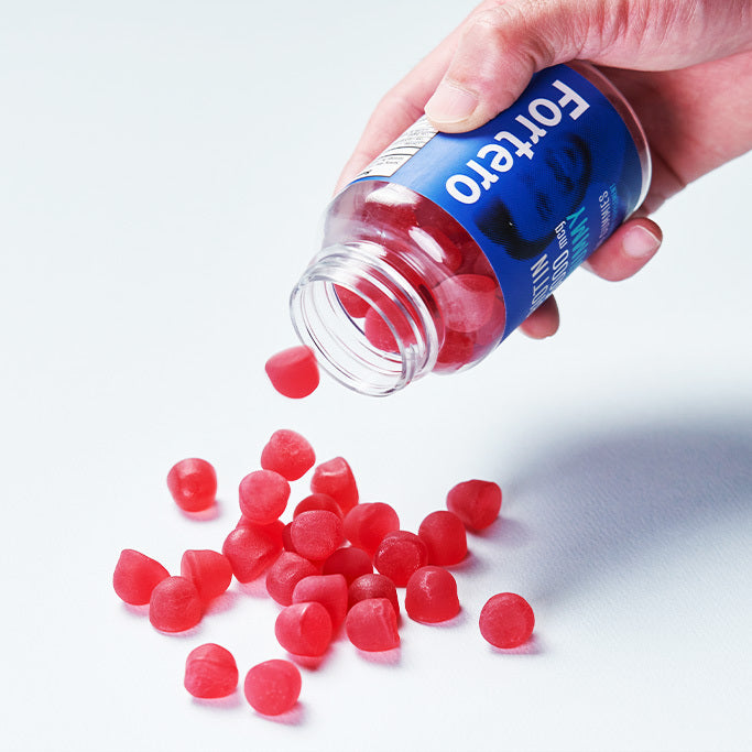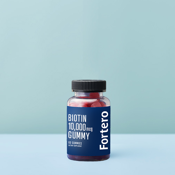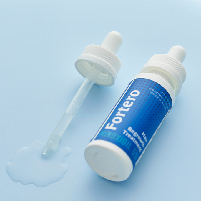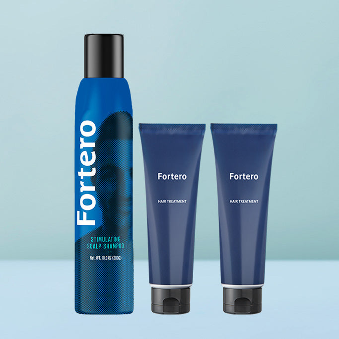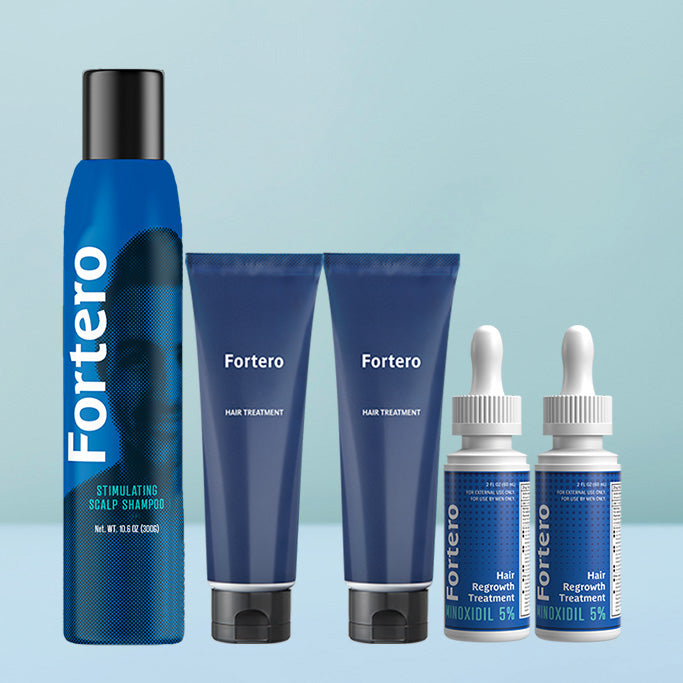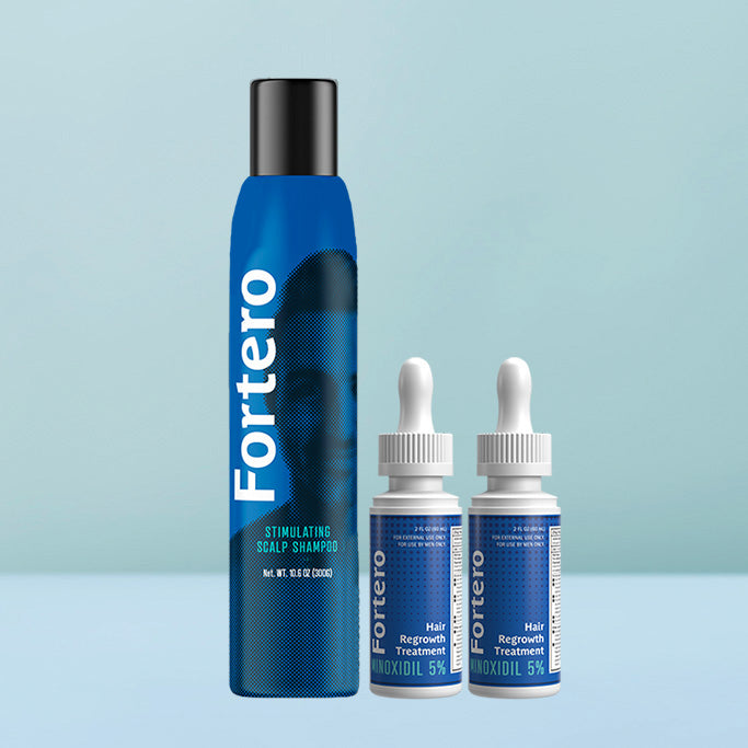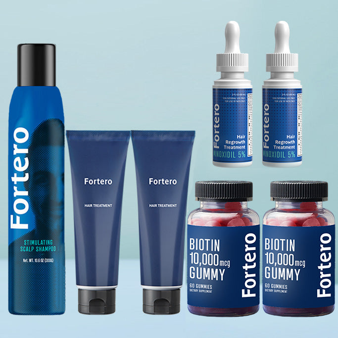 Fortero offers a 4-part attack: the carbonic acid shampoo/conditioner, biotin gummy and minoxidil topical solution all combine for a synergistic effect that reawakes the hair growth process on all parts of the scalp.